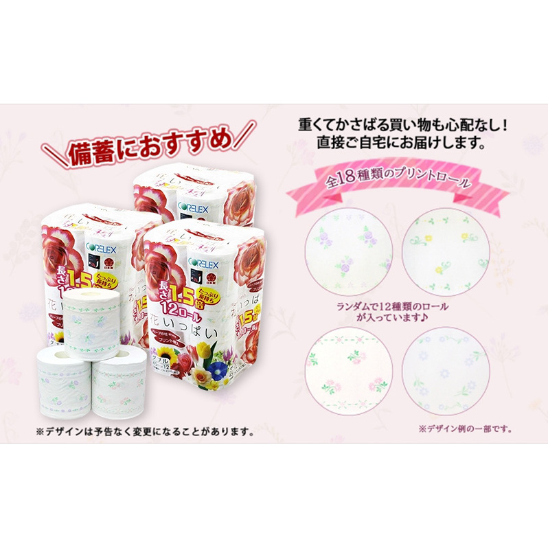 定期便 全3回 長持ち 1.5倍巻き 花いっぱい トイレットペーパー ダブル 45m 計36ロール (12ロール×3パック) 全18種 花柄 プリント ハーブ 香り付き 日本製 まとめ買い 防災 常備品 ペーパー 消耗品 備蓄 送料無料 北海道 倶知安町