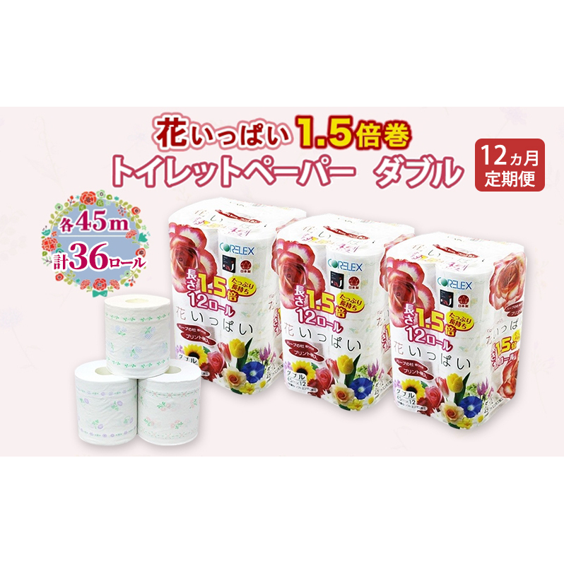 たっぷり長持ち!1.5倍巻き 花いっぱい トイレットペーパー(ダブル)45m 計36ロールセットを12ヵ月連続でお届けいたします!