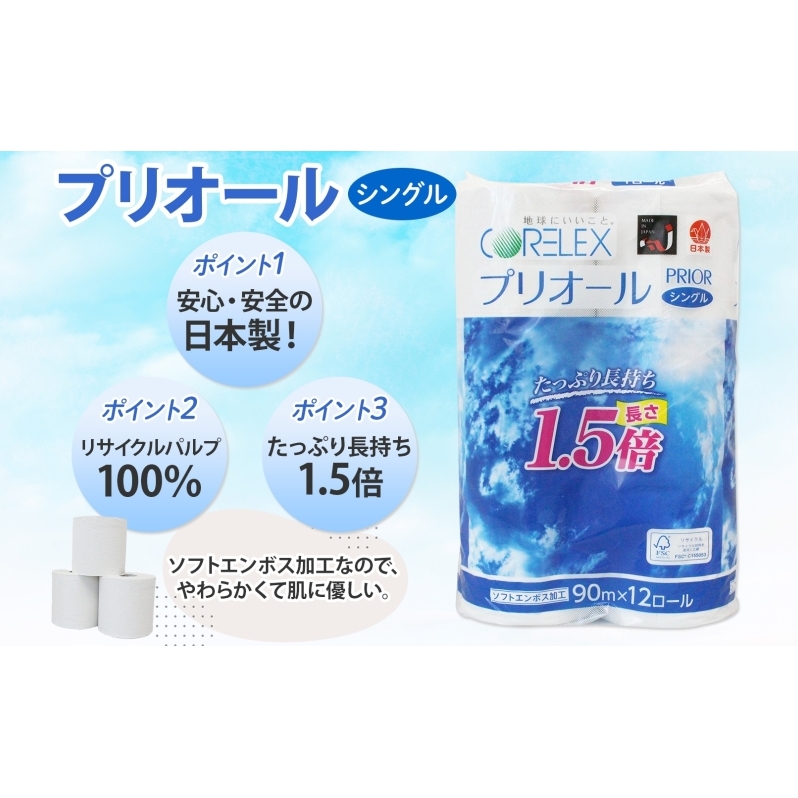 定期便 2ヵ月毎 全6回 プリオール・ピコ トイレット ペーパー 1.5倍巻き シングル 90m 計36ロール (12ロール×3パック) 日本製 まとめ買い リサイクル 防災 常備品 トイレ トイレットペーパー 消耗品 日用品 備蓄 送料無料 北海道 倶知安町