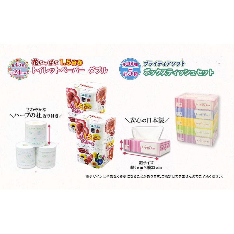 定期便 2ヵ月毎 全3回 長持ち 1.5倍巻き 花いっぱい トイレットペーパー ダブル 45m 24ロール & ブライティア ソフト ボックスティッシュ 200組 400枚 5箱 全18種 花柄 プリント 香り付き 日本製 まとめ買い 防災 常備品 消耗品 備蓄 北海道
