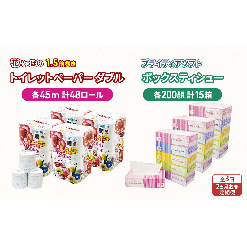 たっぷり長持ち!1.5倍巻き 花いっぱい トイレットペーパー(ダブル)45m 計48ロールとブライティアソフト BOXティッシュ 各200組 計15箱のセットを2ヵ月毎全3回お届けいたします!