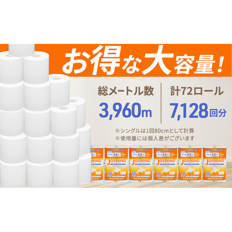 定期便 3ヵ月毎 全2回 ジョイマインドトイレットペーパー ロングロール ダブル 計72ロール (12ロール×6個パック) 長さ55m 2枚重ね 日本製 まとめ買い 防災 常備品 エコ 日用雑貨 消耗品 備蓄 北海道 倶知安町