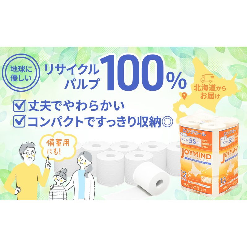 7. 定期便 2ヵ月毎 全6回 ジョイマインドトイレットペーパー ロングロール ダブル 計72ロール (12ロール×6個パック) 長さ55m 2枚重ね 日本製 まとめ買い 防災 常備品 エコ 日用雑貨 消耗品 備蓄 北海道 倶知安町
