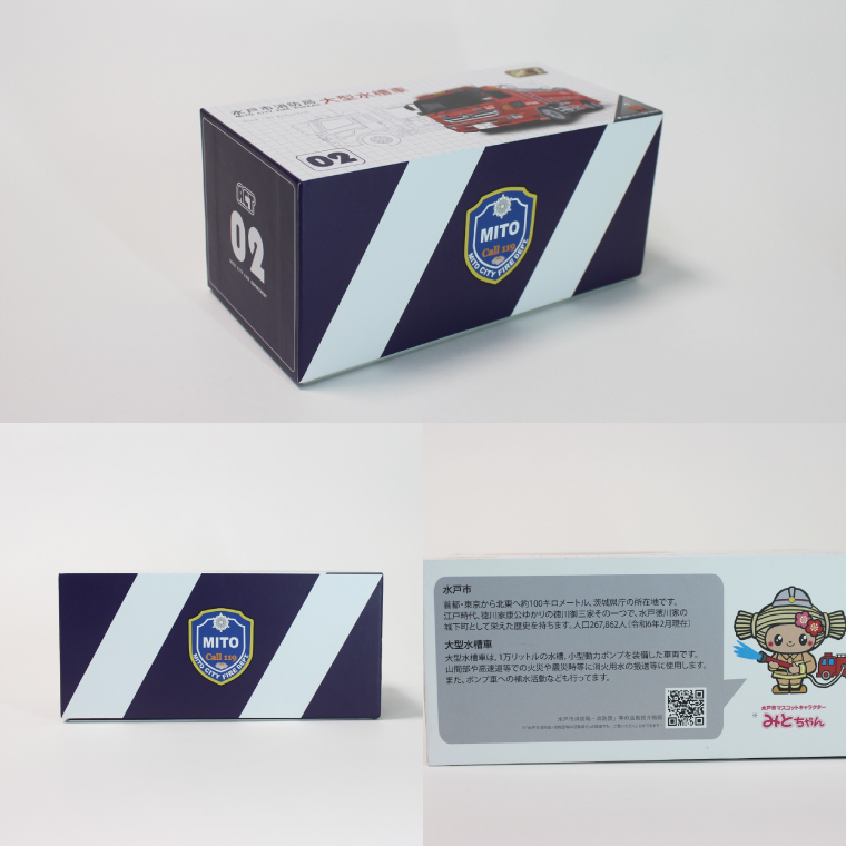 水戸市消防局さまに承認を頂き、固有の所属マークやご当地キャラクターにみとちゃん消防士もパッケージ印刷し地元水戸市のオリジナル感を出してます。