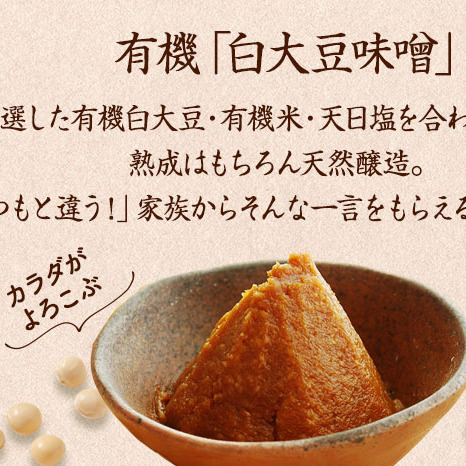 有機白大豆、有機米と天日塩を合わせて造った白大豆味噌です。まろやかな味わいと香ばしさ、やさしい味わいを楽しめるの特長です。天然醸造の生味噌ですので冷蔵保存してください。冷蔵保存している間にも熟成が進み、香り、深みの変化をお楽しみいただけます。お味噌汁に使えば一口目に、「あ、いつもと違う!」家族からそんな一言をもらえる、あなたの料理を変える味噌です。黒大豆味噌とは違ったやや控えめな、素材の味を追う様にふわっと広がる香味を感じてください。