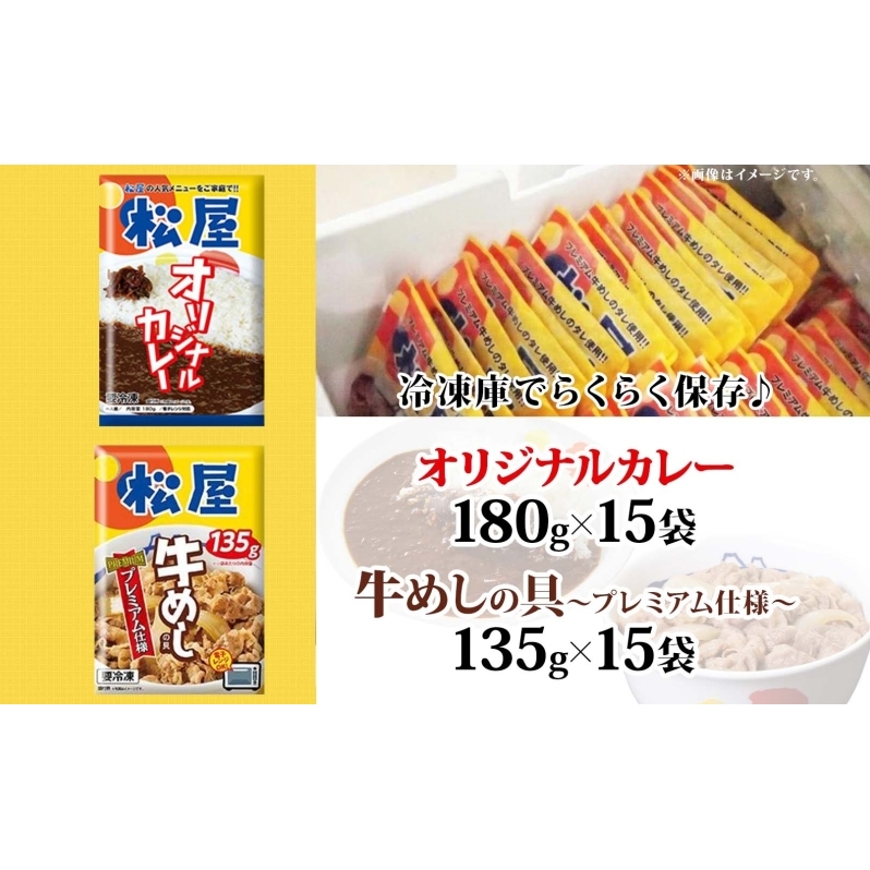 松屋 オリジナルカレーの具 180g 牛丼 プレミアム仕様 牛めしの具 135g 各15袋 30袋 セット 牛肉 牛めし カレー 辛口 スパイス カレギュウ レトルト 冷凍 時短 簡単 便利 手抜き レンチンおかず 保存食 備蓄 夜食 埼玉県 嵐山町