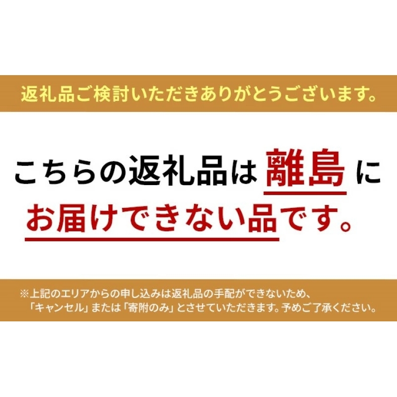 ※上記エリアからの申し込みは返礼品の手配が出来ないため「キャンセル」または「寄附のみ」とさせていただきます。予めご了承ください。
