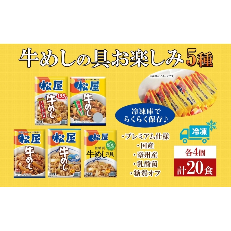 7. 松屋牛めしの具 5種20個 お楽しみセット 豪州産 国産 糖質オフ お肉 牛 冷凍 時短 簡単 便利 保存 ストック 総菜 夕食 夜食 レンチン おかず 玉ねぎ おつまみ ビールのお供 ご飯のお供 お取り寄せ グルメ 非常食 備蓄 夜食 肉好き 牛丼 埼玉県 嵐山町
