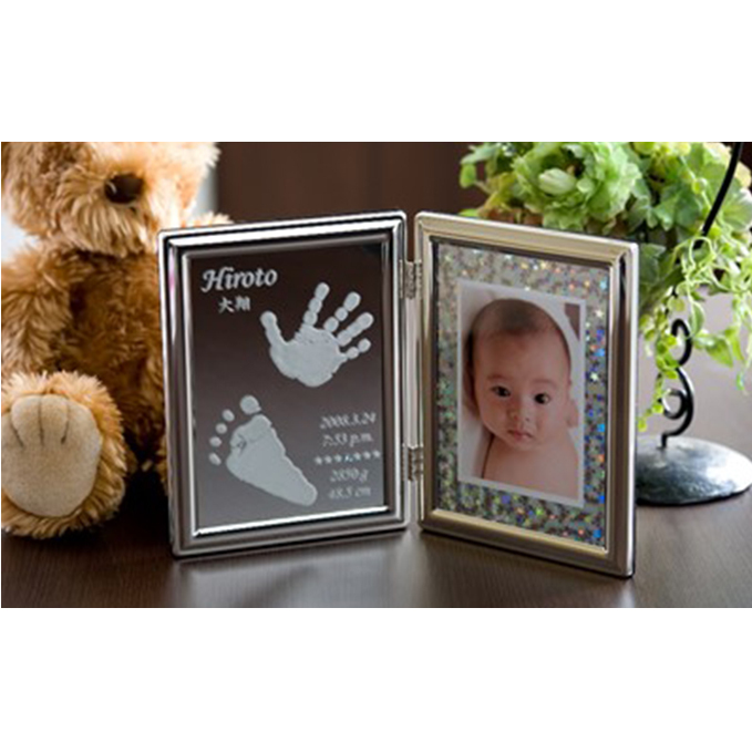 落ち着いた柔らかな白い光沢を放つ、シルバータイプの赤ちゃん手形・足形フォトフレームです。