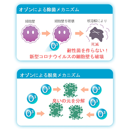 オゾンの力で新型コロナ、インフルエンザ、ノロウイルス、その他細菌などを空間除菌、さらにニオイの元を分解脱臭、あなたのまわりの空気を清浄し安心空間を創出する。