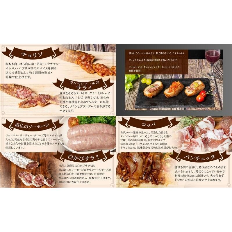 白かびサラミ 90g / チョリソ 80g / モンベリアールのサラミ 80g / コッパ 50g / パンチェッタ 70g / 南仏のソーセージ 160g