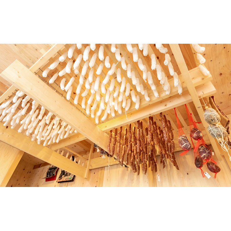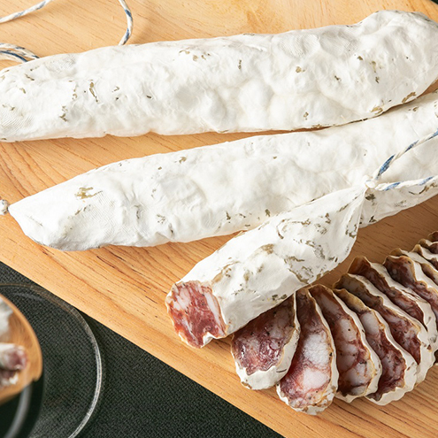 フランス3都市「トゥール・リヨン・オランジュ」でシャルキュトリーの修行をし、帰国後、高山の名店「キュルノンチュエ」の番頭、責任者として7年勤務したのちMontbazonオープン。フランス製法にこだわり、ひとつ一つ丁寧に時間をかけて仕上げます。当店人気商品の白かびサラミは腸詰めしたソーセージにカマンベールチーズと同系統の白かび菌を植え付け約3週間の熟成・乾燥で仕上げます。お酒のお供、バゲットとの相性は抜群です。