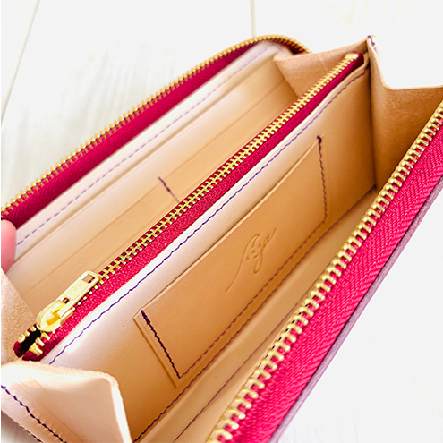 仕入れから裁断・縫製・仕上げまで、すべてを一人で手掛ける現役ママ職人 Aya による一点モノのロングウォレット。
