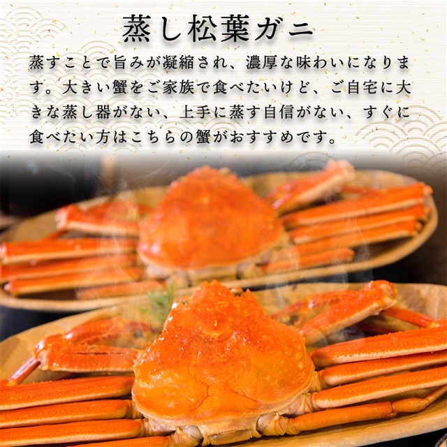 冬の日本海で水揚げされた松葉ガニを丁寧に蒸しました。閉じ込めたカニの旨みをたっぷりとお楽しみください。 ※訳あり品です、足折れなどが含まれます ※水揚げ状況等により発送までお時間をいただく場合があります ※蟹の重量は蒸す前の活蟹の重量になります、蒸した後は重量が2割前後軽くなります