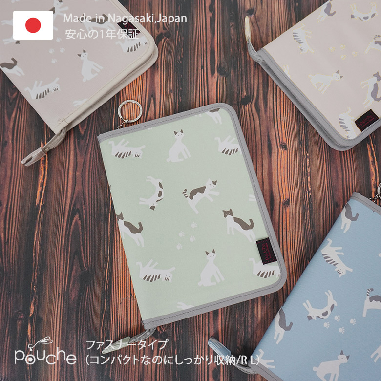 AH132-1 マルチケース (ファスナータイプ)尾曲がり猫 Lモデル 1個 エクルベージュ【 母子手帳ケース 2人分 猫 動物 アニマル かわいい おしゃれ 軽量 Pouche ポーチェ 長崎県 島原市 】