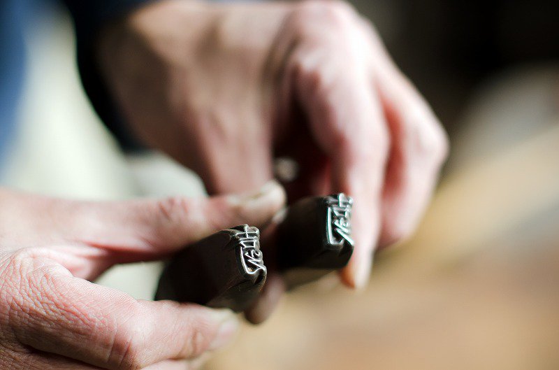 熟練の技で生み出される「吉光」の手打刃物。工程によっては一日寝かせる作業もあるので、正直、一日に1本もできあがりません。安易に急いで量産することなどせず、じっくりと時間をかけて1本ずつ仕上げていきます。一生使っていただける最高のものを目指しています。最後に魂を込めて、刻印を入れます。