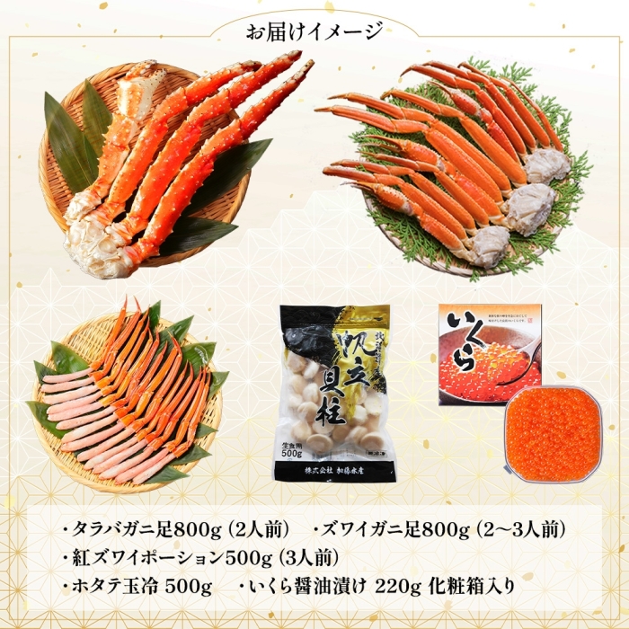 3290. カニ 豪華 海鮮 宝箱 タラバガニ ズワイガニ 蟹足 紅ズワイガニ ポーション いくら 醤油漬け ホタテ 玉冷 蟹 かに タラバ蟹 ずわい蟹 帆立 イクラ 100000円 北海道 弟子屈町
