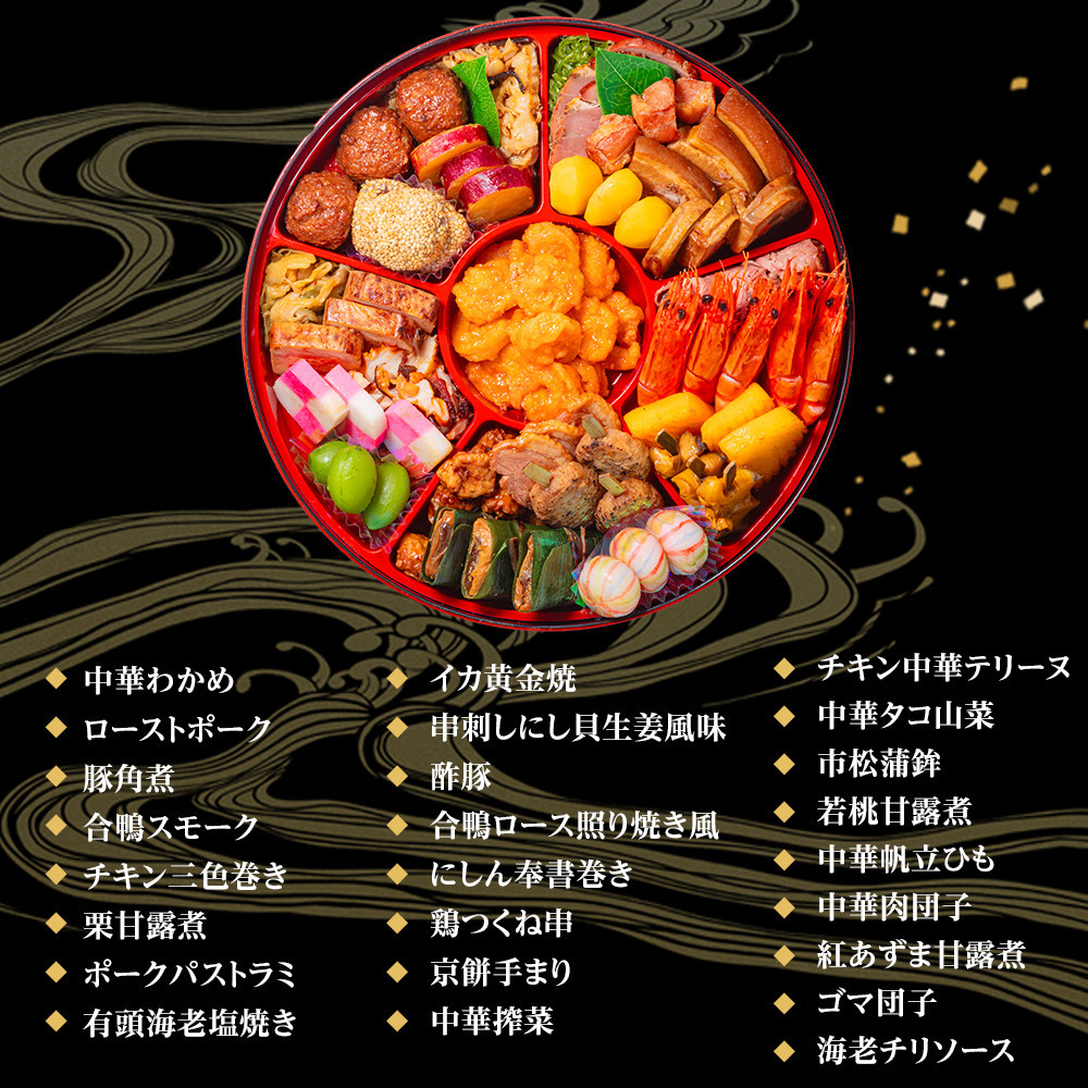中華わかめ、ローストポーク、豚角煮、合鴨スモーク、チキン三色巻き、栗甘露煮、ポークパストラミ、有頭海老塩焼き、イカ黄金焼、串刺しにし貝生姜風味、酢豚、合鴨ロース照り焼き風、にしん奉書巻き、鶏つくね串、京餅手まり、中華搾菜、チキン中華テリーヌ、中華タコ山菜、市松蒲鉾、若桃甘露煮、中華帆立ひも、中華肉団子、紅あずま甘露煮、ゴマ団子、海老チリソース