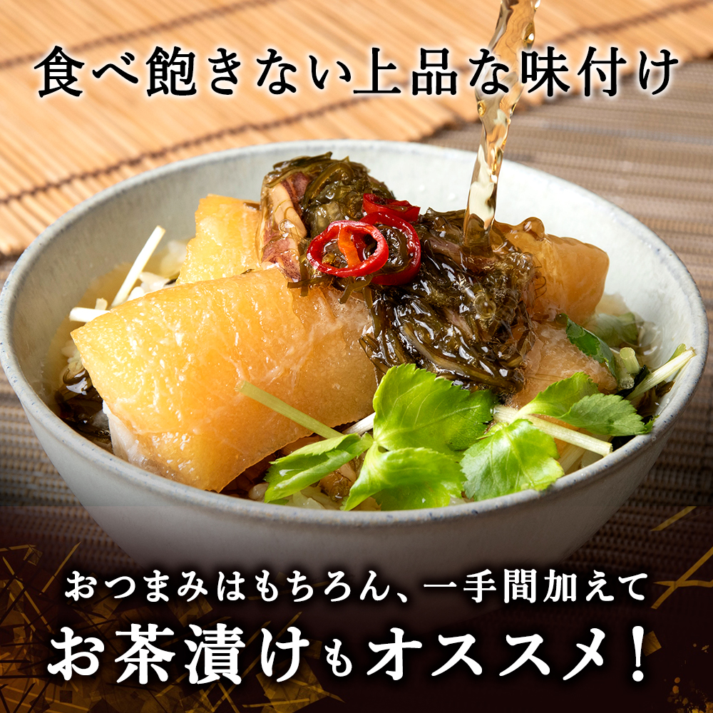 さっくり歯ごたえのニシン数の子、刻み昆布の粘り、茎わかめのコリコリ感に、お刺身でも食べられるほど鮮度のいいスルメイカを干して刻んだものを加えて、旨味もたっぷりに仕上げました。添加物は使わずに、醤油や酒、みりん等の昔ながらの調味料で味付けしています。240g×5袋(総重量1.2kg)入りと、ボリュームも満点。