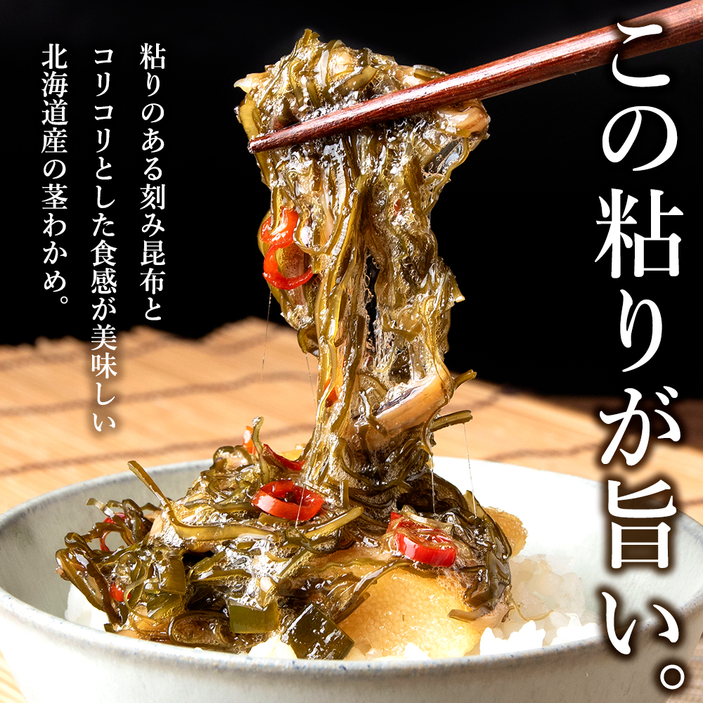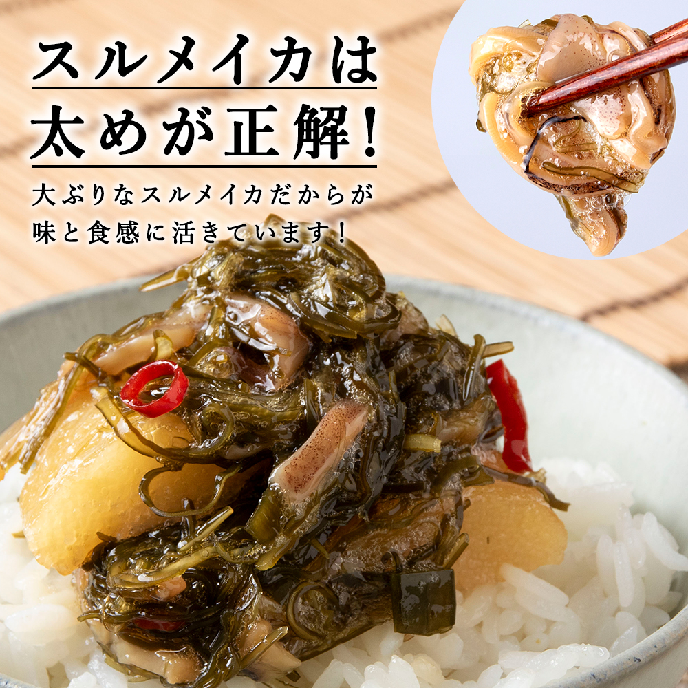 さっくり歯ごたえのニシン数の子、刻み昆布の粘り、茎わかめのコリコリ感に、お刺身でも食べられるほど鮮度のいいスルメイカを干して刻んだものを加えて、旨味もたっぷりに仕上げました。添加物は使わずに、醤油や酒、みりん等の昔ながらの調味料で味付けしています。240g×5袋(総重量1.2kg)入りと、ボリュームも満点。