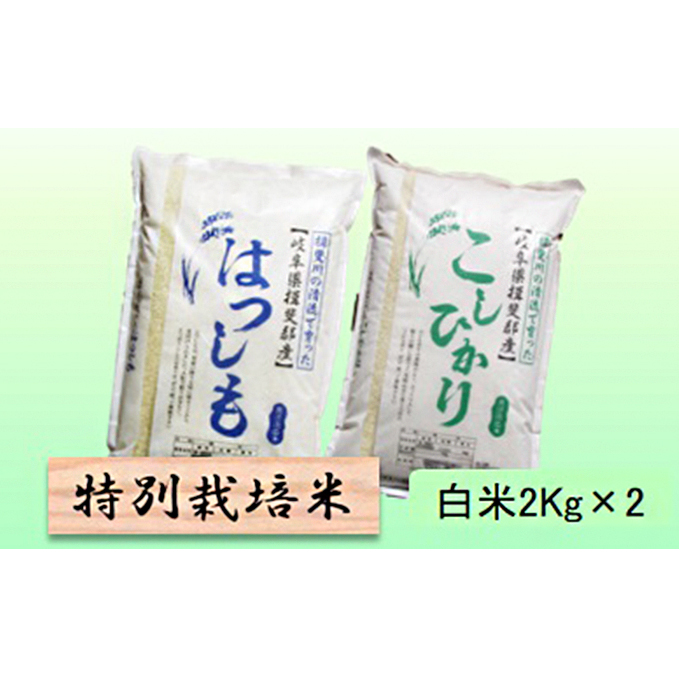 日本を代表する品種で「お米の王様」とも呼ばれ、味・艶・食感のバランスが取れたお米【コシヒカリ】と、岐阜県でも西美濃地方でしか栽培されていない大粒でアッサリ食感の県民御用達のお米【ハツシモ】 のセットです。(特別栽培米)(栽培期間中50%減農薬)