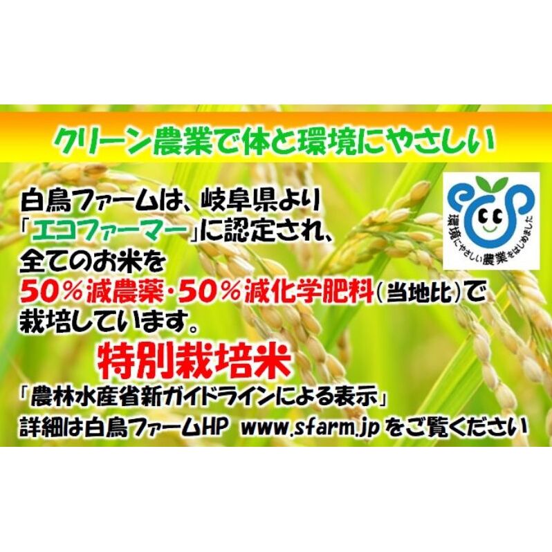 日本を代表する品種で「お米の王様」とも呼ばれ、味・艶・食感のバランスが取れたお米です。源流に石灰岩の山々を持ち、ミネラルたっぷりの水が流れる清流揖斐川の水を利用し、栽培期間中農薬・化学肥料を50%以下で育てた安心・安全で美味しいお米です。(特別栽培米)(栽培期間中50%減農薬)