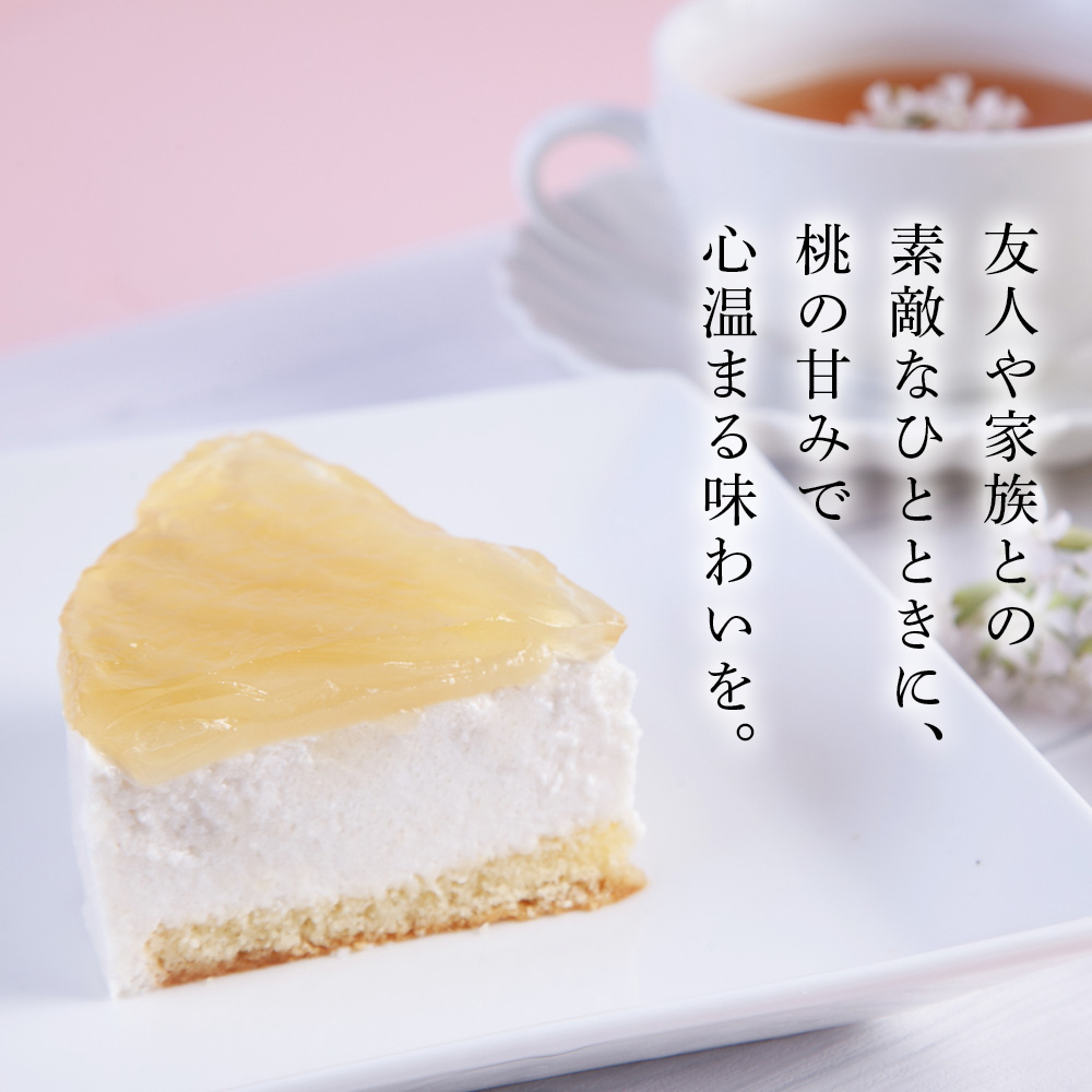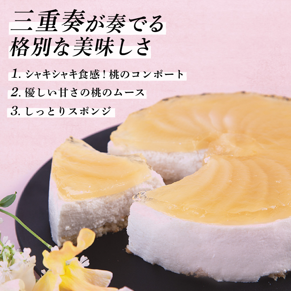 とろけるムース、シャキシャキとした食感が残る透き通った桃、そしてゼリーの3層仕上げになった冷やして食べたい一品です。