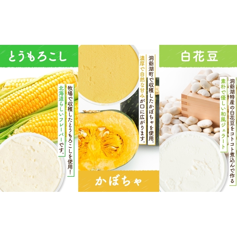 7. 定期便 5ヵ月 連続 全5回 北海道 まきばのジェラート 6種 各2個 計12個 セット ジェラート ミルク 赤しそ カムイミンタルの塩 とうもろこし かぼちゃ 白花豆 アイスクリーム 保存料不使用 シャーベット アイス 牛乳 氷菓