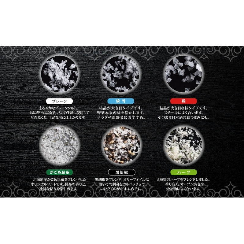 7. 北海道 噴火湾 窯焚自然塩 カムイ・ミンタルの塩 6種 ギフト セット プレーン 淡雪 粒 がごめ昆布 黒胡椒 ハーブ スタンド 瓶 自然塩 塩 ソルト おにぎり 東洋炉材 送料無料 食卓 味付け