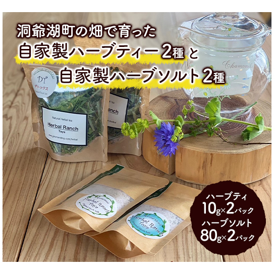 「洞爺湖の自然の中、馬の堆肥を使って育てたハーブを丁寧な手作業で乾燥させました。お茶として2種、ハーブソルト2個を詰め合わせでお届けします。