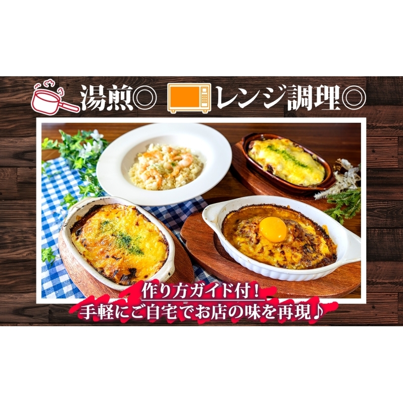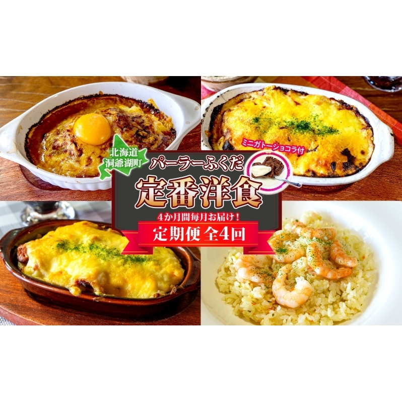 定期便 4カ月連続 パーラーふくだ特製 焼きチーズカレー ミートドリア 伊達産鶏の照り焼きチキンドリア エビピラフ ミニガトーショコラ付 北海道 財田米 伊達産鶏 スイーツ 手作り 洋食 湯煎 レンジ調理 冷凍 パーラーふくだ 洞爺湖町