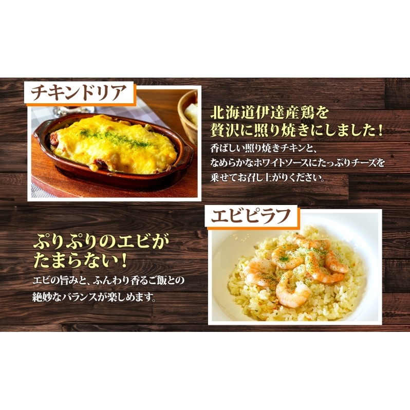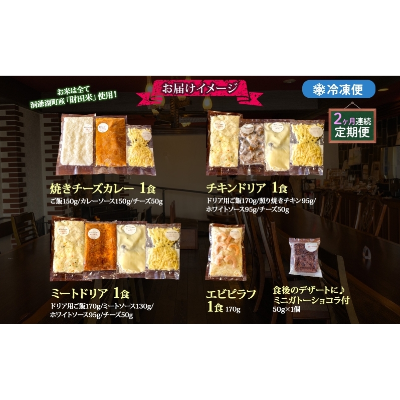 定期便 2カ月連続 パーラーふくだ特製 焼きチーズカレー ミートドリア 伊達産鶏の照り焼きチキンドリア エビピラフ ミニガトーショコラ付 計4食 食べ比べセット 北海道 財田米 伊達産鶏 洋食 湯煎 レンジ調理 冷凍 パーラーふくだ 洞爺湖町