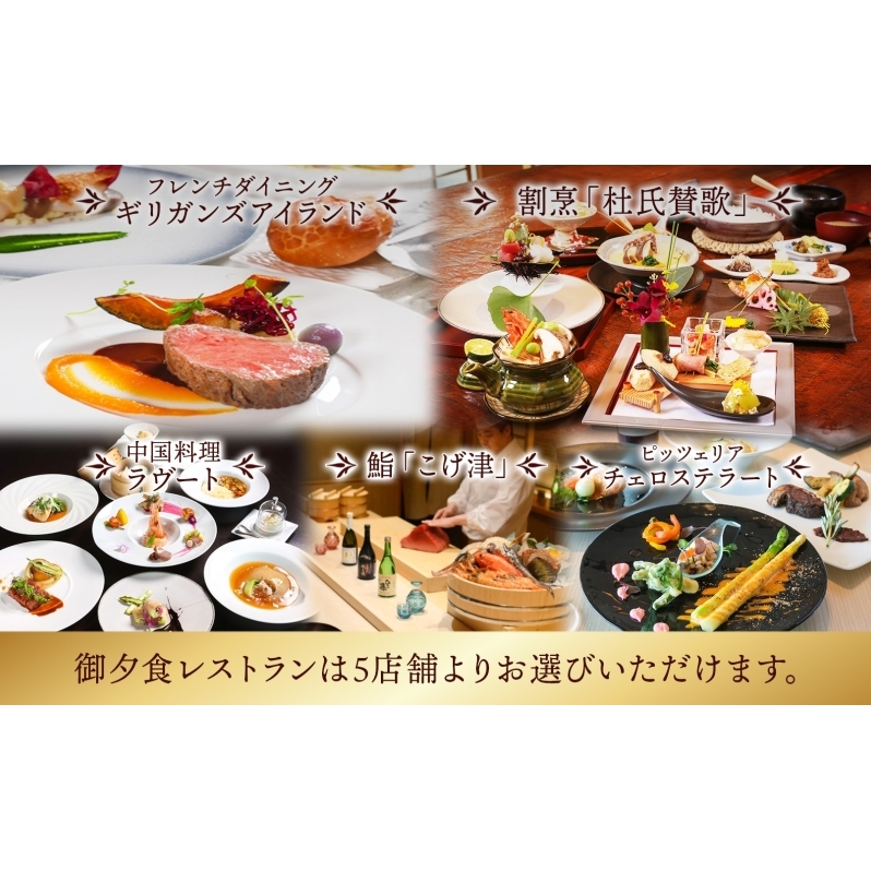 ※ご夕食レストランは、フレンチダイニング「ギリガンズアイランド」、割烹「杜氏賛歌」、中国料理「ラヴート」、鮨「こげ津」、ピッツェリア「チェロステラート」の5店舗よりお選び頂けます。レストランのご予約状況によりご希望に添えない場合もございますので、早めのご予約をお勧めいたします。ご朝食は、スパークリングワイン付の洋食と地元の食材を使ったこだわりの和定食よりお選びいただけます。また、食物アレルギーがございましたら事前にお申しつけ下さいますようお願い申し上げます。その他、食事の内容等につきましても事前予約時にご確認下さいますようお願い申し上げます。