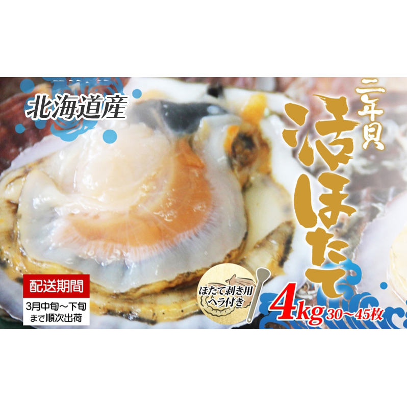 北海道産 活ほたて 2年貝 約 4kg 30枚~45枚 2026年3月中旬~3月下旬頃お届け 殻付き 貝付き 帆立 ホタテ ほたて 貝 魚介 海産 海鮮 貝柱 噴火湾 刺身 焼き フライ 生産者支援 産地直送 送料無料