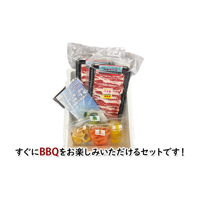 洞爺あか牛の焼肉用バラ肉400g(200g×2パック)と冷凍野菜4種のセットをお届けします。