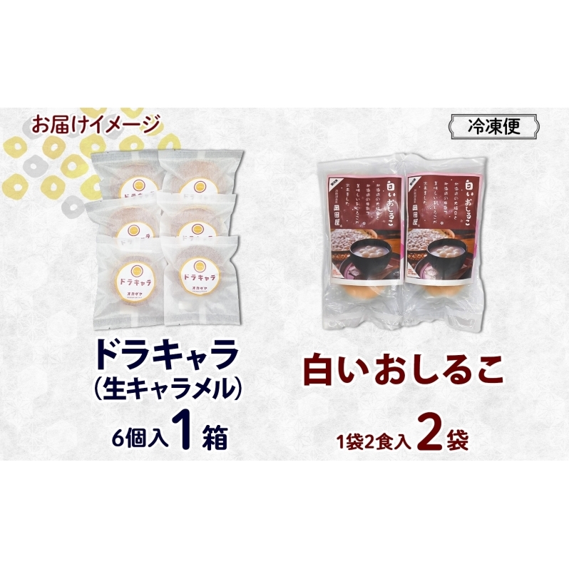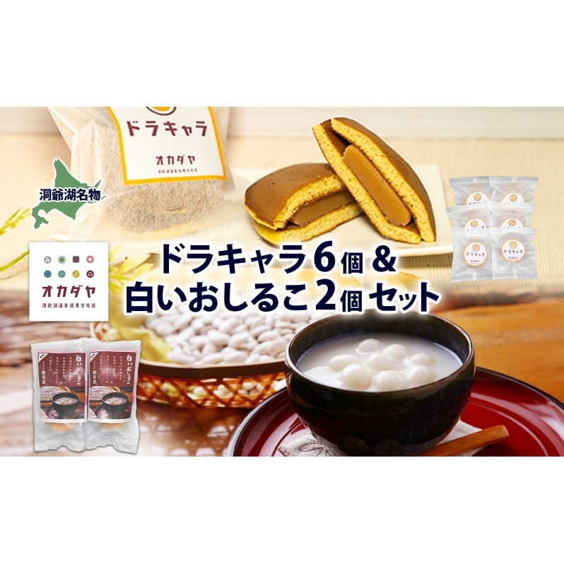 北海道 白いおしるこ 2個 ドラキャラ 6個 セット おしるこ お汁粉 どら焼き 生キャラメル キャラメル 大福豆 スイーツ 和菓子 甘味 ご当地 老舗 洞爺湖温泉 岡田屋 お取り寄せ プレゼント 送料無料 洞爺湖