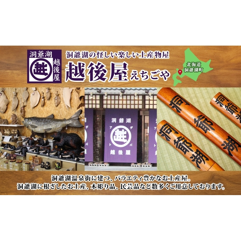 洞爺湖越後屋では、洞爺湖に根ざしたお土産、木彫り品、民芸品など数多くご用意しております。