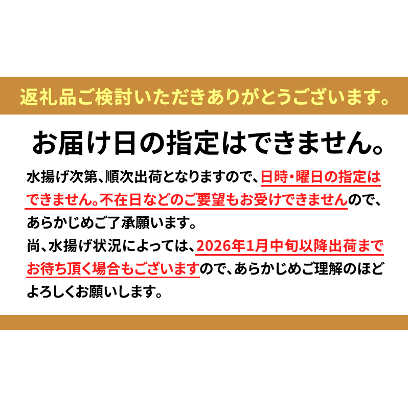 ※水揚げ状況によっては、2026年1月中旬以降出荷までお待ち頂く場合もございますので、あらかじめご理解のほどよろしくお願いします。
