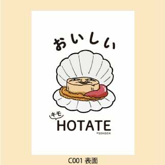 (株)ソーゴーが独自にデザインしたホタテイラストでTシャツ1枚、A4ペーパーホルダー2枚、シール1枚のセットです。