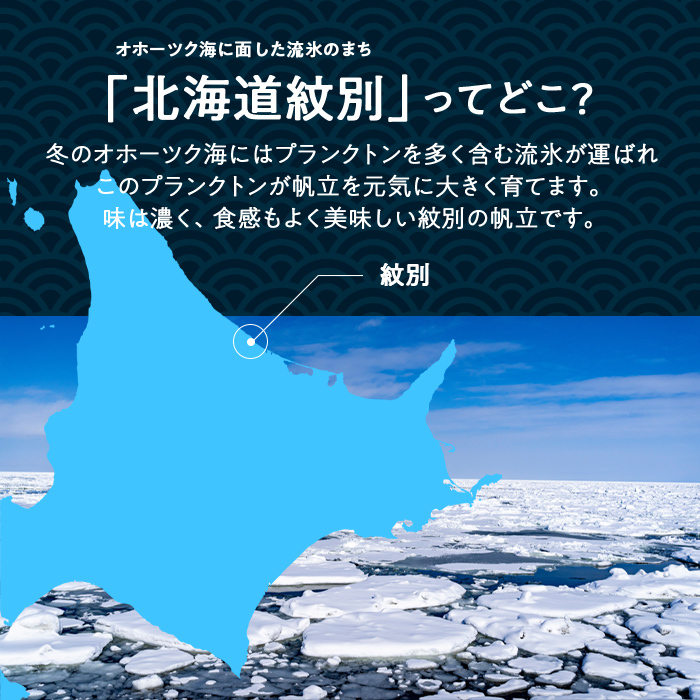 【北海道の一等の証、紋別でとれた海の幸。自信を持って食卓へお届けしたいから、最上級の気持ちを込めたブランドネーム。ぜひ、お召し上がりください。】寒さの厳しい冬の北海道の海で大量のプランクトンを食べて育った北海道産の天然ホタテは身がプリプリで甘味がたっぷりです。ホタテの味は鮮度が命なので、水揚げ後すぐに工場で処理をします。この工程のスピードで味が大きく変わるので、剥いた身は最新技術の特殊な冷凍方法で生きているのと変わらない状態で凍結します。鮮度抜群の状態で、一個ずつバラで急速冷凍をかけて美味しさを閉じ込めているので、食べたい時に食べたい分だけ解凍できます。中国禁輸につき、ぜひ応援よろしくお願いします。