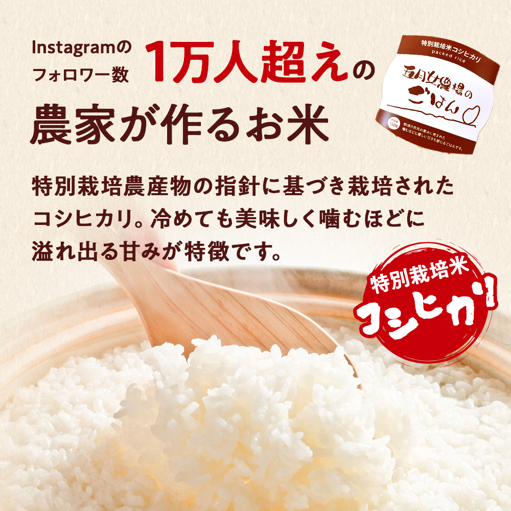 数ある田んぼの中から、特に食味値と品質が高いお米だけを厳選。特別栽培米コシヒカリを贅沢に使い、手軽に楽しめるパックごはんに仕上げました。