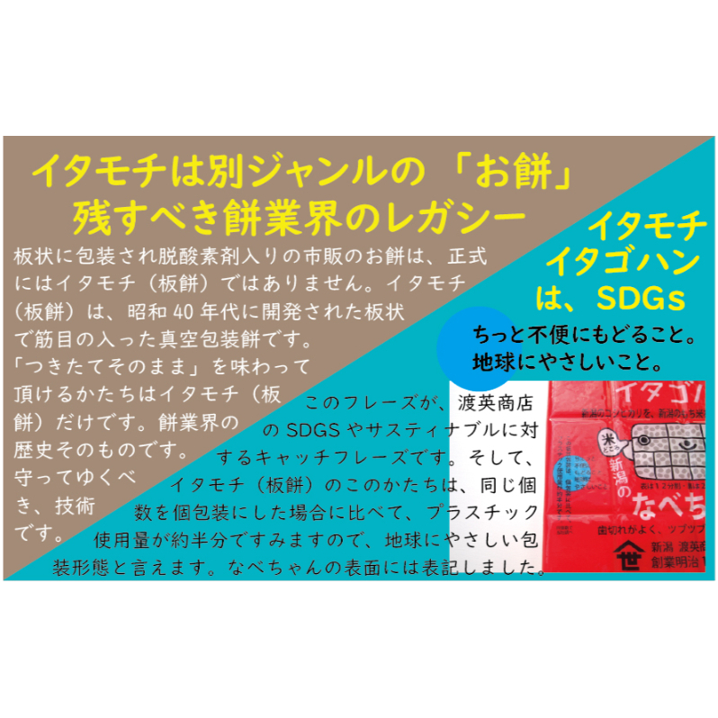 昭和40年代に開発された餅業界の革新的スタイルであるイタモチ(板餅)の「玄米餅」になります。この玄米餅は、渡英商店において、年間の販売伸び率が一番の商品になります。健康ブームからももちろんですが、一番は、その味わいと食感にあると思います。「一度食べたら、白いお餅がものたりない!」というのが製造者やお客様からの感想になります。原料は、新潟県産の水稲もち米玄米100%を使い、粗くついておりますので、ツブツブが残っています。焼いていただくと表面がカリッとし、玄米特有の香ばしさがひろがります。まずは何も付けないで召し上がって頂きたく思います。その後は、お醤油でも、砂糖醤油でも、きな粉砂糖でも、のりを巻いて磯辺焼きでも、白いお餅と同様にお召し上がり下さい。また、粗くついたお餅ですので、お鍋等の汁物との相性も抜群です。玄米生活をしたいのに、玄米を炊くことが面倒だと言う方々へも、玄米食エントリーとして、この玄米餅(イタモチ)は最適と思います。大変リピーター率の高い玄米餅ですので、まずは召し上がって頂ければ幸いです。