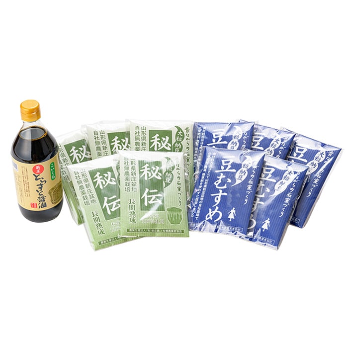 納豆・醤油共に、無農薬・無化学肥料で自社栽培した大豆・小麦を使用。