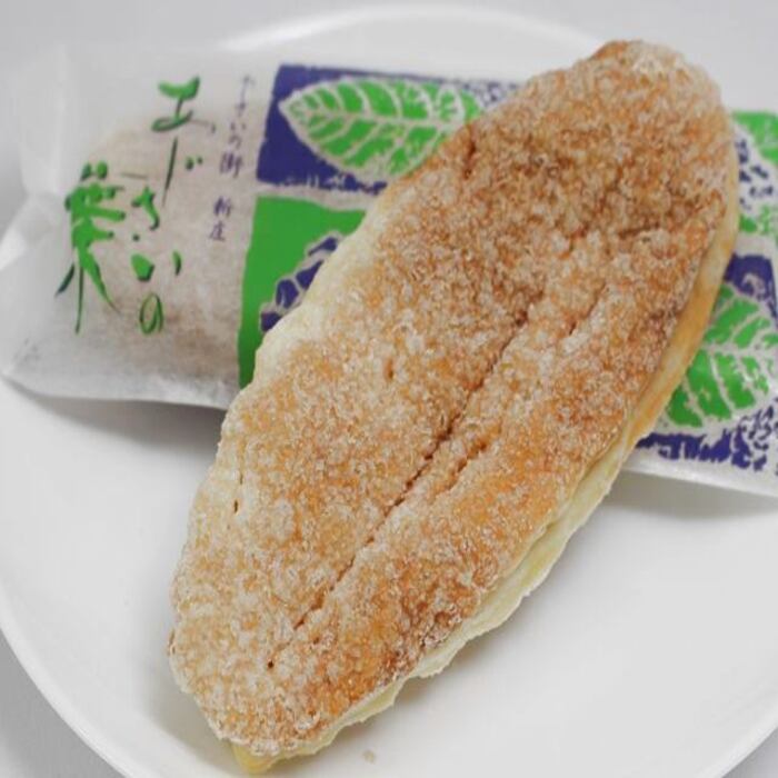 山形県新庄市の花「あじさい」の葉を型どったパイ生地に、グラニュー糖をのせて焼き上げ、キャラメルバタークリームを挟み込みました。