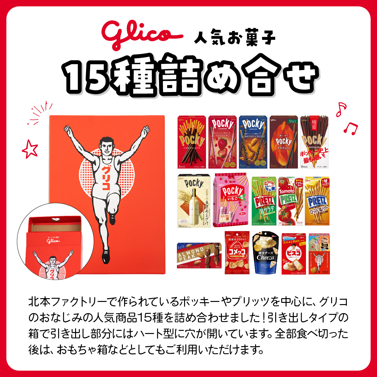 北本ファクトリーで作られているポッキーやプリッツを中心に、グリコのおなじみの人気商品15種を詰め合わせました!人気の首都圏エリア限定の<東京あまざけポッキー>入りです。グリコデザインの大箱サイズは、高さ44cm×幅32cm×奥行8.5cmとかなりのビックサイズ!引き出しタイプの箱で引き出し部分にはハート型に穴が開いています。全部食べ切った後は、おもちゃ箱などとしてもご利用いただけます。