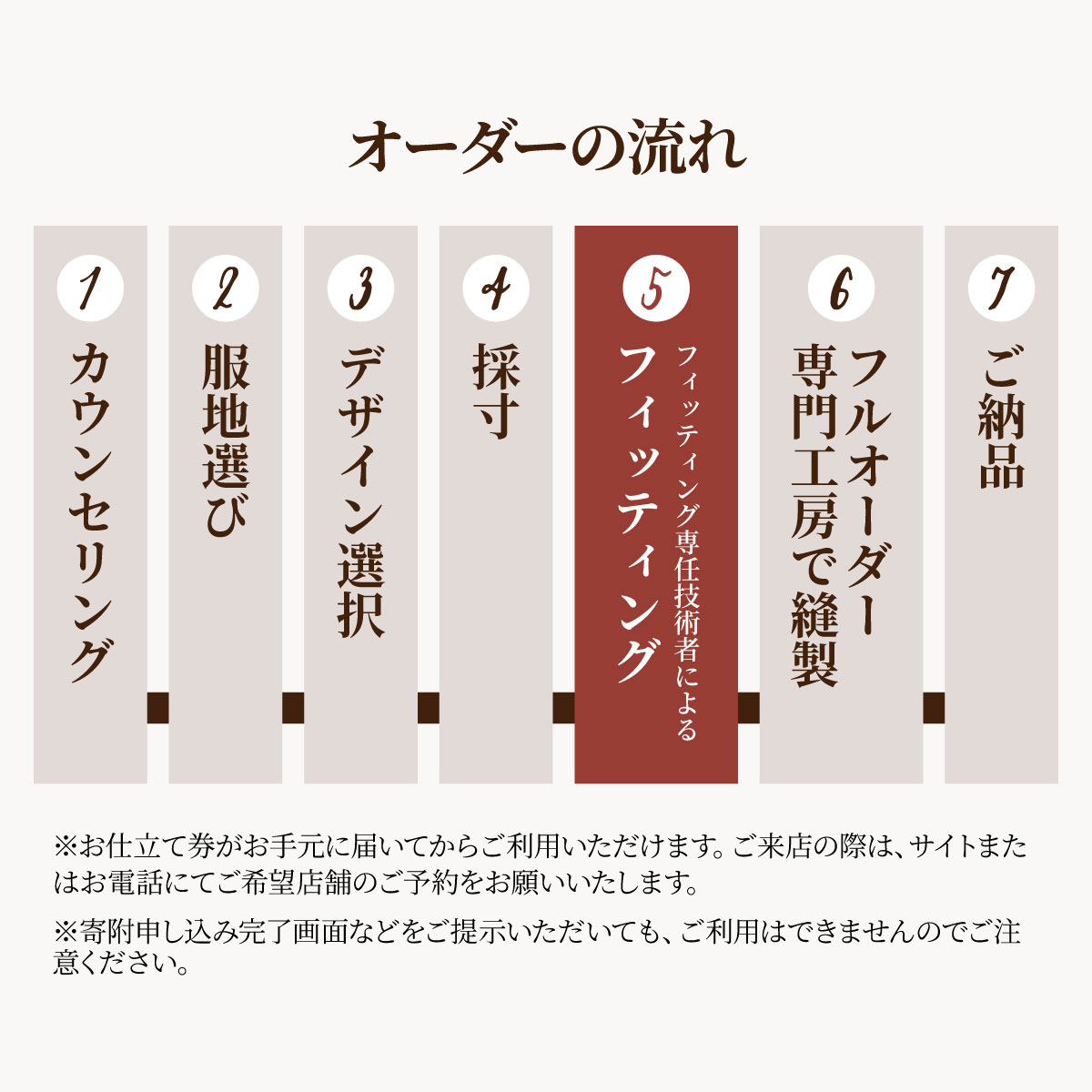 ※生地から仕立てるフルオーダースーツ店のため、3回(採寸・仮縫い・受取)のご来店が必要となります。