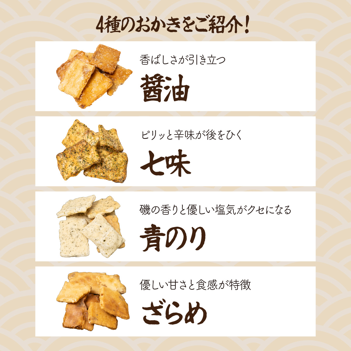 当社オリジナルブレンド醤油や、素材の味を活かした塩味など、こだわりのかき餅を是非、ご賞味ください。