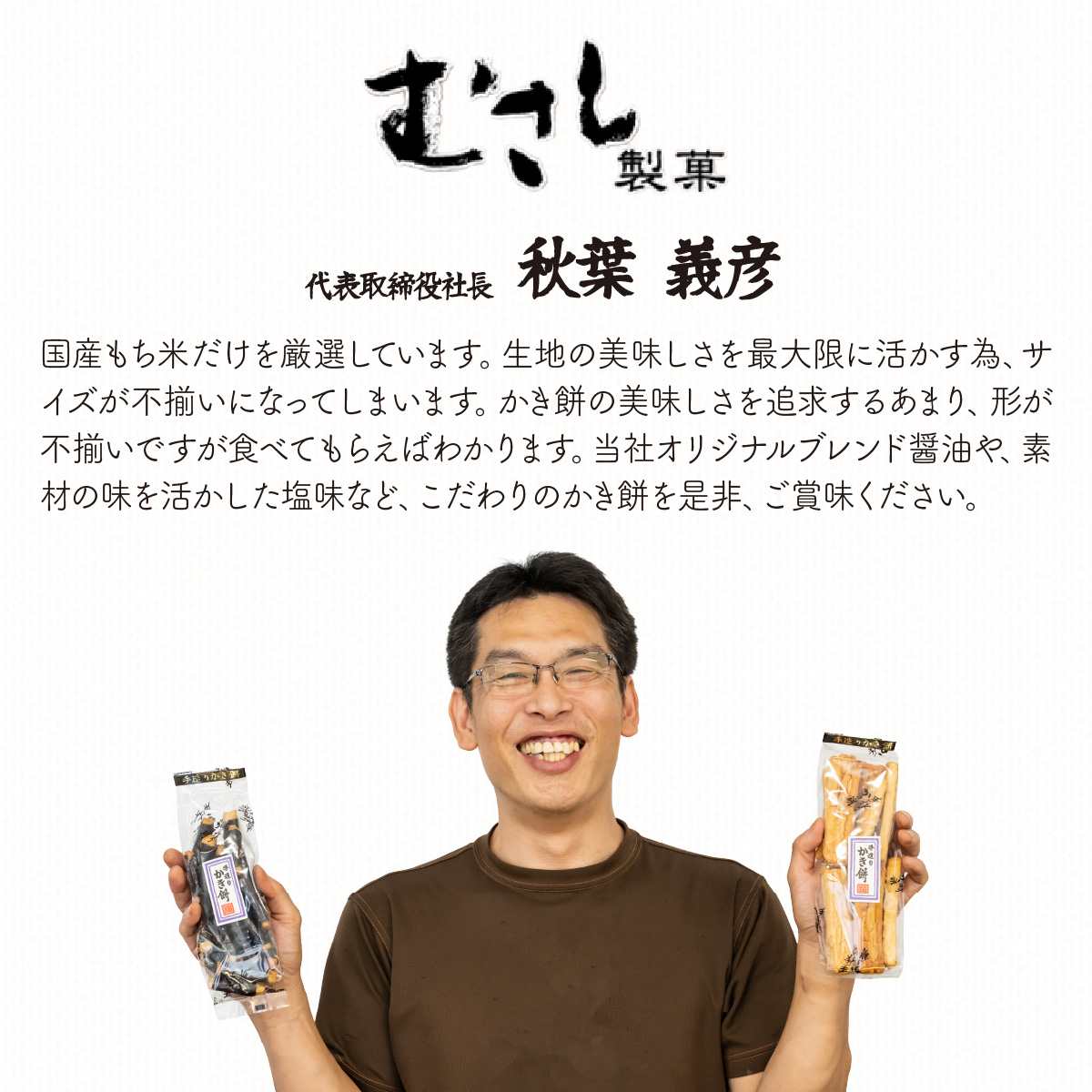 武蔵製菓が作るおかきは国産のもち米のみを使用し、添加物等は一切使用していません。