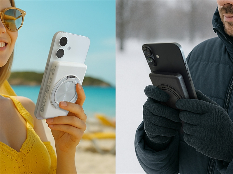 安全性に優れる「準固体電池」を採用した、容量5000mAhのワイヤレス充電対応モバイルバッテリーです。スマホリング一体型で、充電中も安定した状態でお使いいただけます。