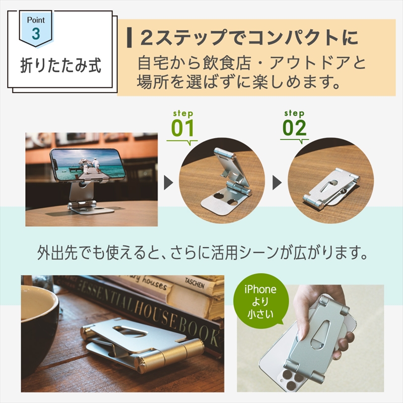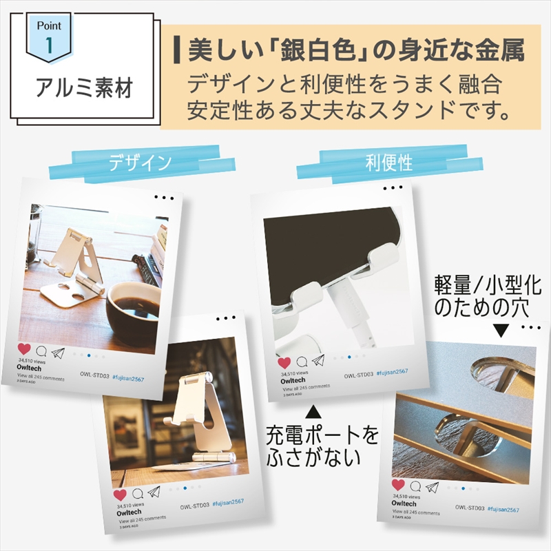 シンプルなアルミスタンドは自宅はもちろん職場など、どんな場所に設置しても違和感なく溶け込むデザインです。